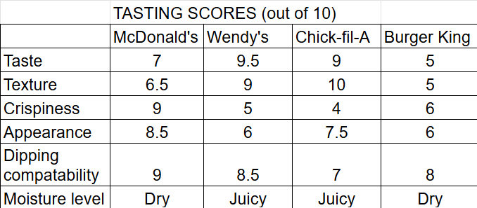 The guidelines on rating the nuggets were broken down into six basic categories: texture, flavor, crispness, dipping compatibility, and moisture level. Each category was assigned a score out of ten, except the moisture level, which was based solely on description. Each nugget was tasted first without dipping sauce, and then again dipped into ketchup to assess drippage.